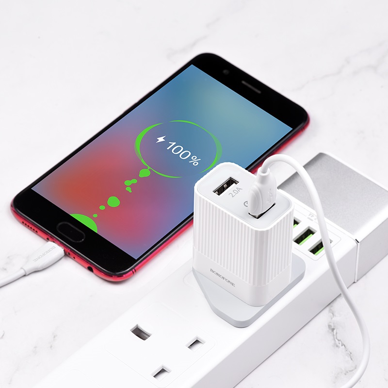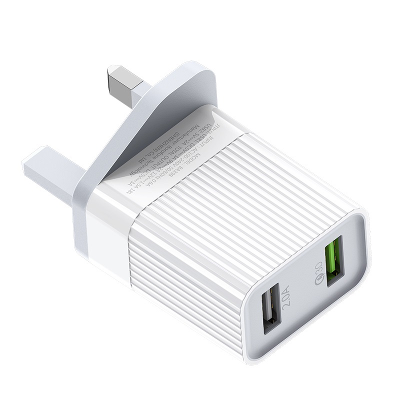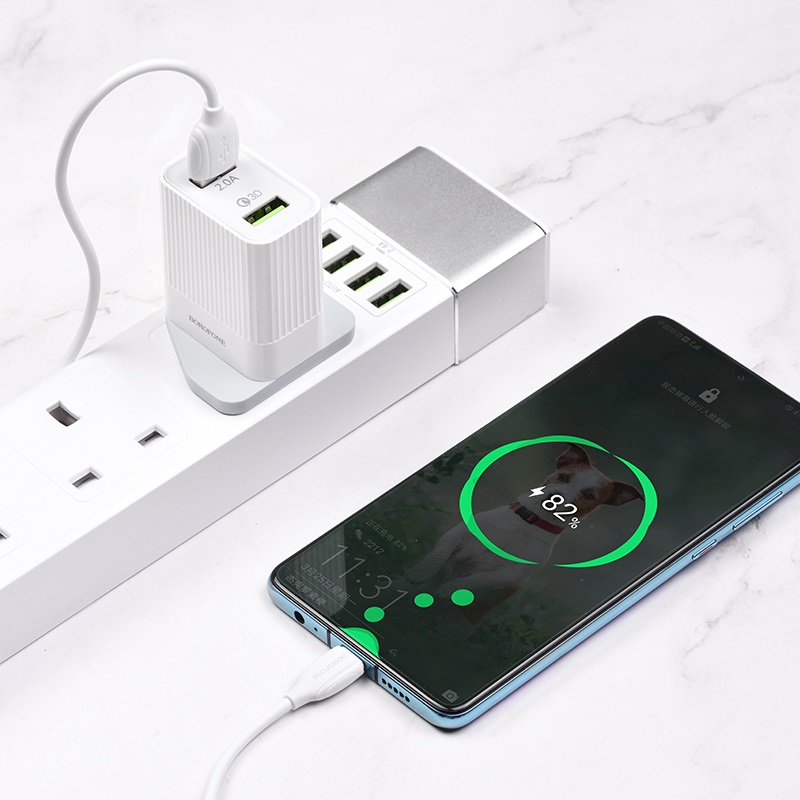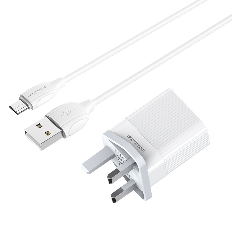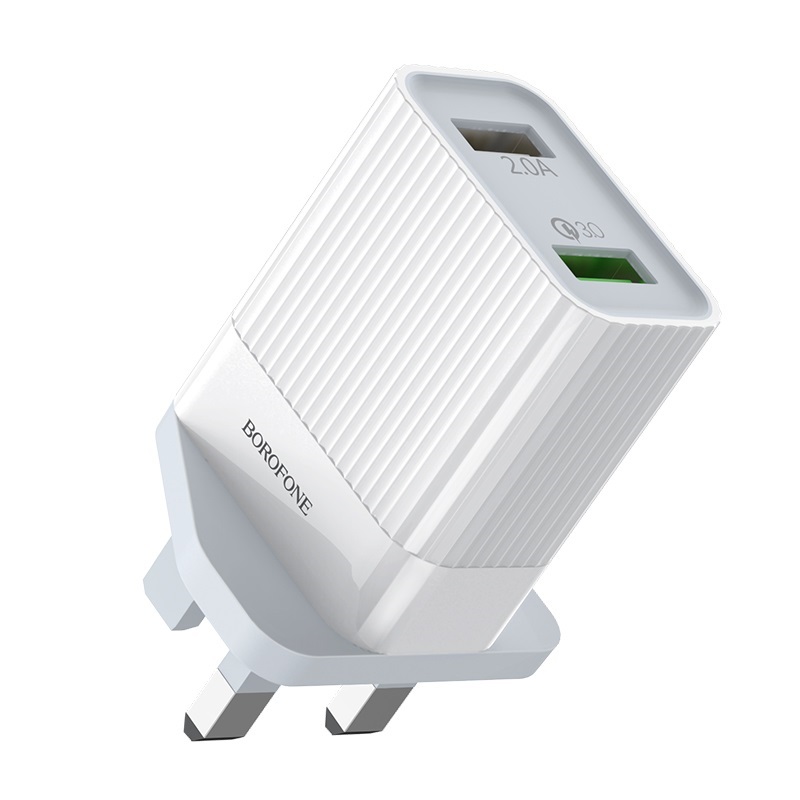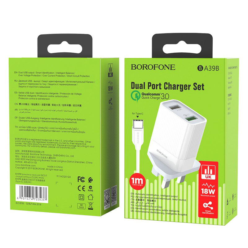 BOROFONE BA39B Speedway, wall charger with dual USB output, support for QC3.0 / QC2.0, Huawei fast charge FCP, Samsung fast charge AFC, APPLE 2.4A, set with Lightning / Micro-USB / USB-C cable, UK plug