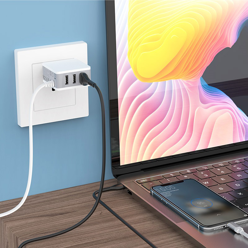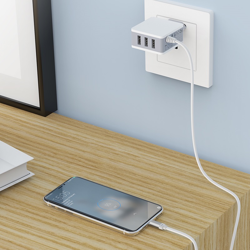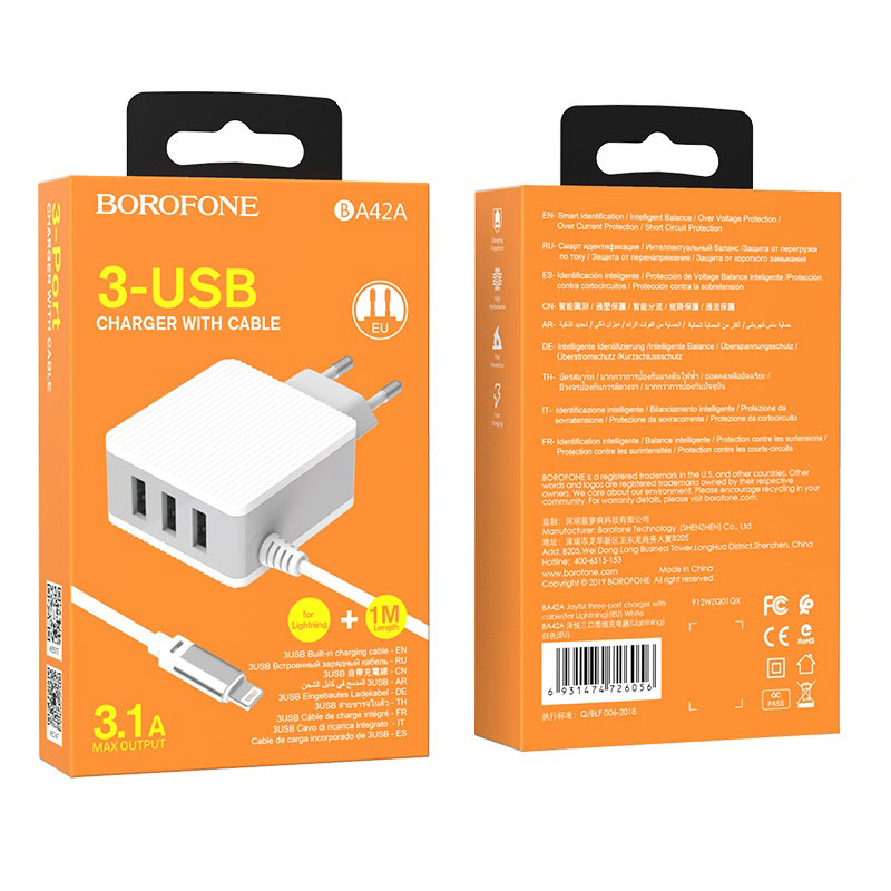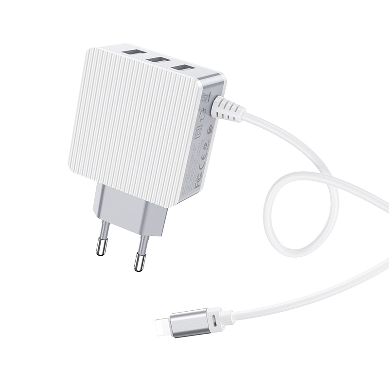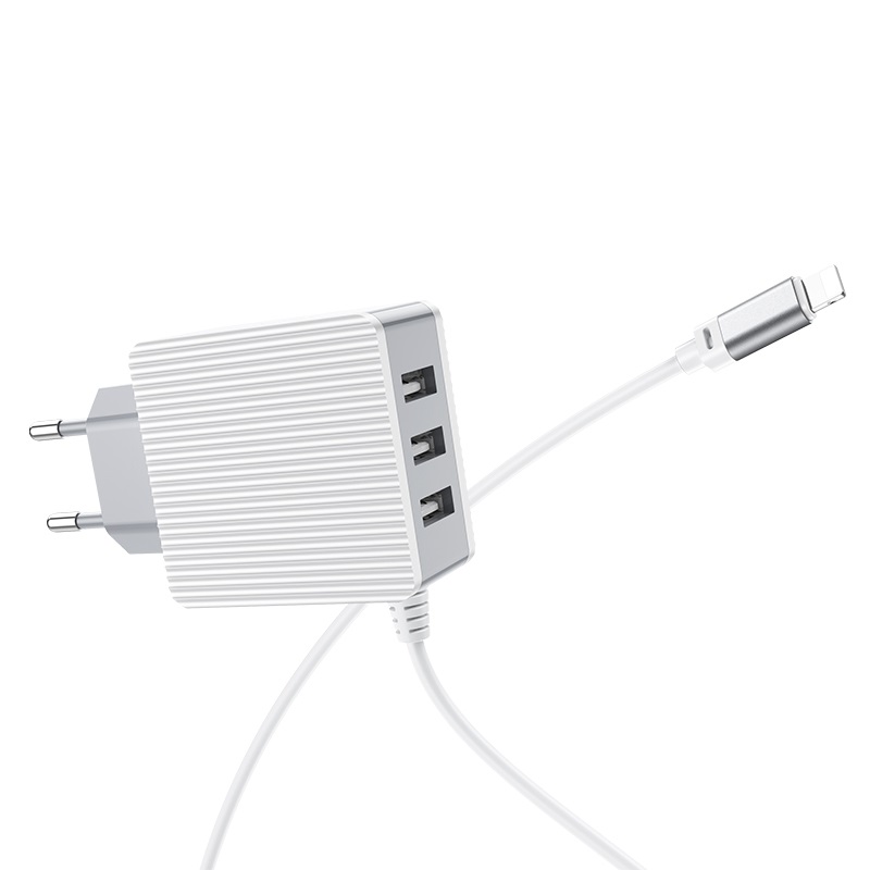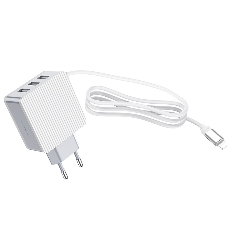 BOROFONE BA42A Joyful, wall charger, three USB output, current 3.1A, EU plug, with built-in cable for Lightning / Micro-USB / USB-C